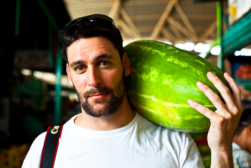 Rich dodging his way through stacks of dried fish and fresh fruit.